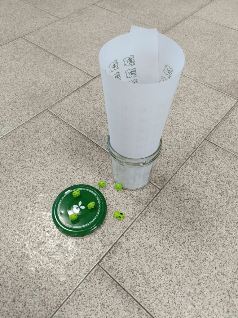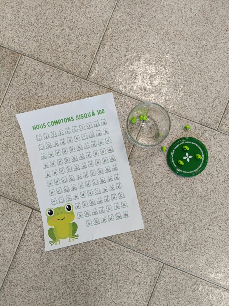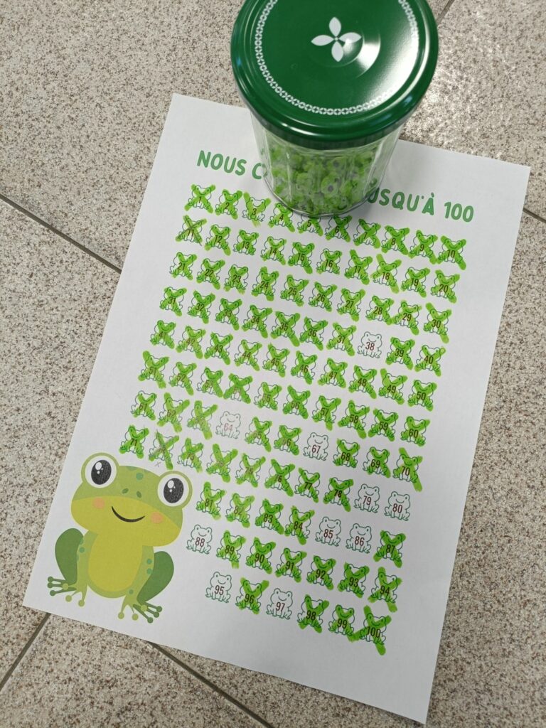 Pour nous rappeler celles déjà trouvées, nous avons fait une croix sur la feuille sur les grenouilles déjà rangées dans le pot que nous avons appelé le nénuphar.