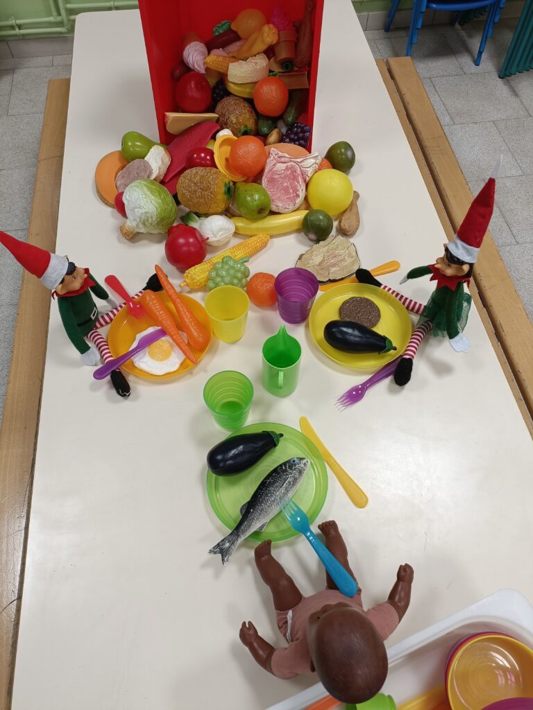 Le bébé poupée mange un poisson et une aubergine. Ses couverts sont jaune et bleu. Son verre est vert. L’assiette est verte.