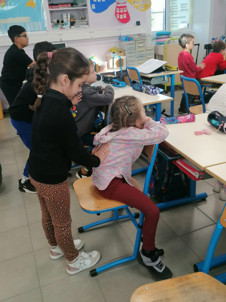 Les élèves ont vécu cette première séance au travers de mouvements simples et imagés tels que les lunettes, la prise du chat, le boulanger, la cuillère et le toucher du front.