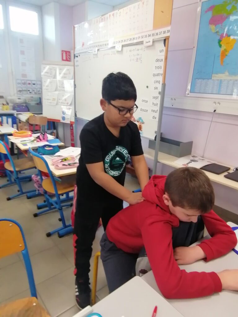 Après nos petites séances hebdomadaires de cohérence cardiaque et de méditation en classe, nous découvrons les massages grâce à Lydie et ce, lors de cinq séances à raison de une fois par semaine tous les lundis matins.